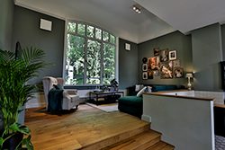 The original blue stone steps give access to the main floor. The first view of the interior is stunning. Where before you had the Duchess’s painting studio you now have a living space with an open kitchen, a big table and – up a few more steps – a living room. All is bathed in light, thanks to two big windows in the kitchen and an even bigger one in the living room. A smaller window next to the front door looks out on to the path back to the fruit wall.