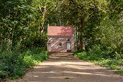 The prettiest view of Antonine’s Atelier is from the car park by the restored fruit wall that is the last remnant of the walled kitchen garden. From the open gate leads an inviting path that takes you past monumental trees and flowering shrubs right to the holiday home. After a few dozen metres you pass by a wrought-iron gate set between two imposing pillars, the official entrance for guests staying at the Atelier. The charming little brick building with its red tiled roof is now to be seen, set in a clearing in the wood.